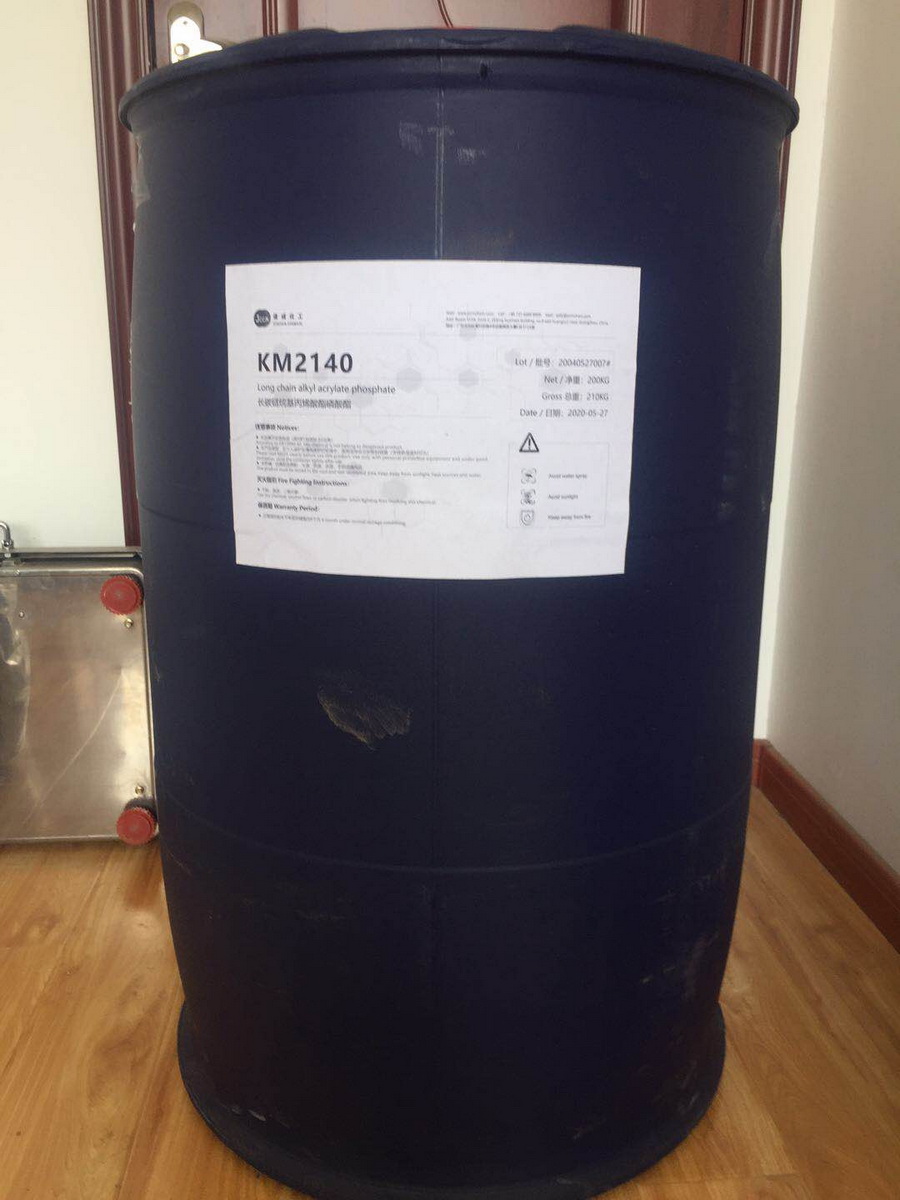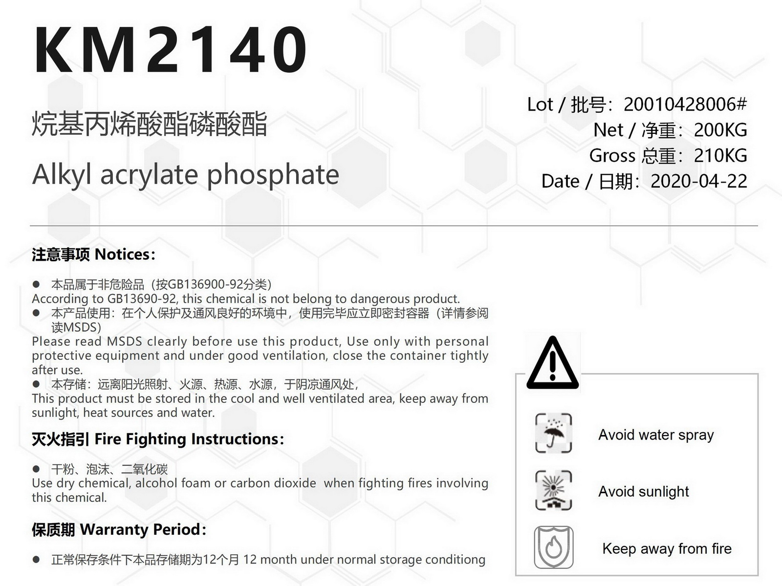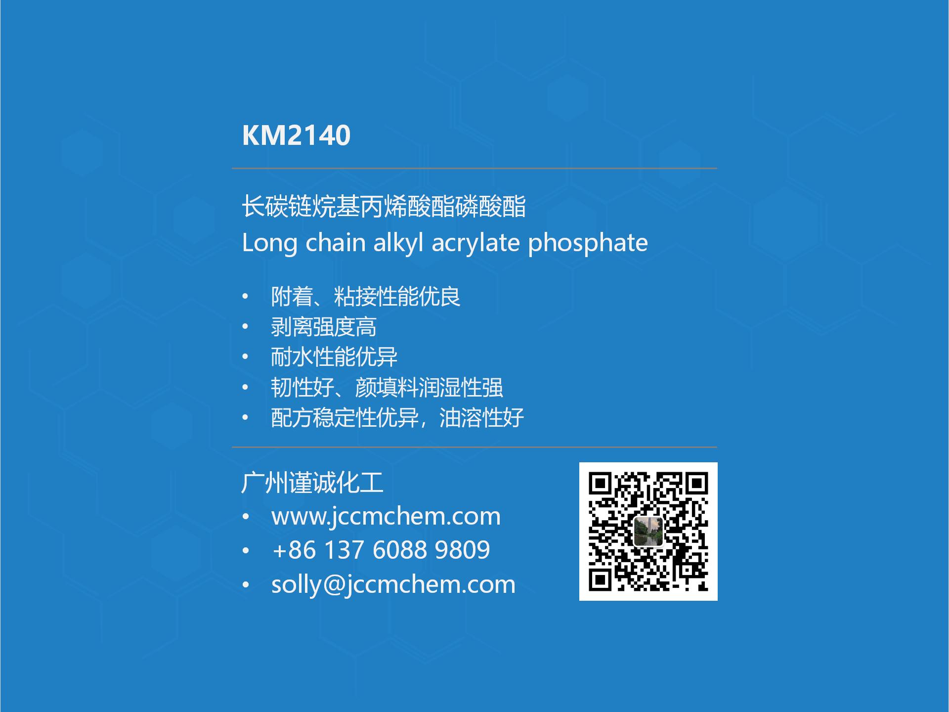 KM2140是一款结构特殊的烷基丙烯酸酯磷酸酯,其柔韧性、附着力、耐水、耐溶剂性等综合性能好,目前在甲油胶、皮革涂料等领域表现出优异的性能。